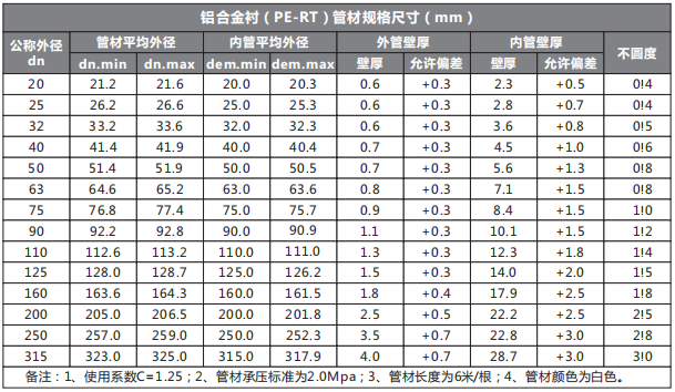 外层铝合金:外层铝合金层采用6063航天合金无缝铝管,颜色为白色,表面采用高温喷涂树脂材料,使外层铝管不仅有较强的硬度且提高了铝合金管耐酸碱、耐腐蚀性能,与建筑墙体颜色一致,永不褪色,永保华丽外观。内层为PE-RT材料。